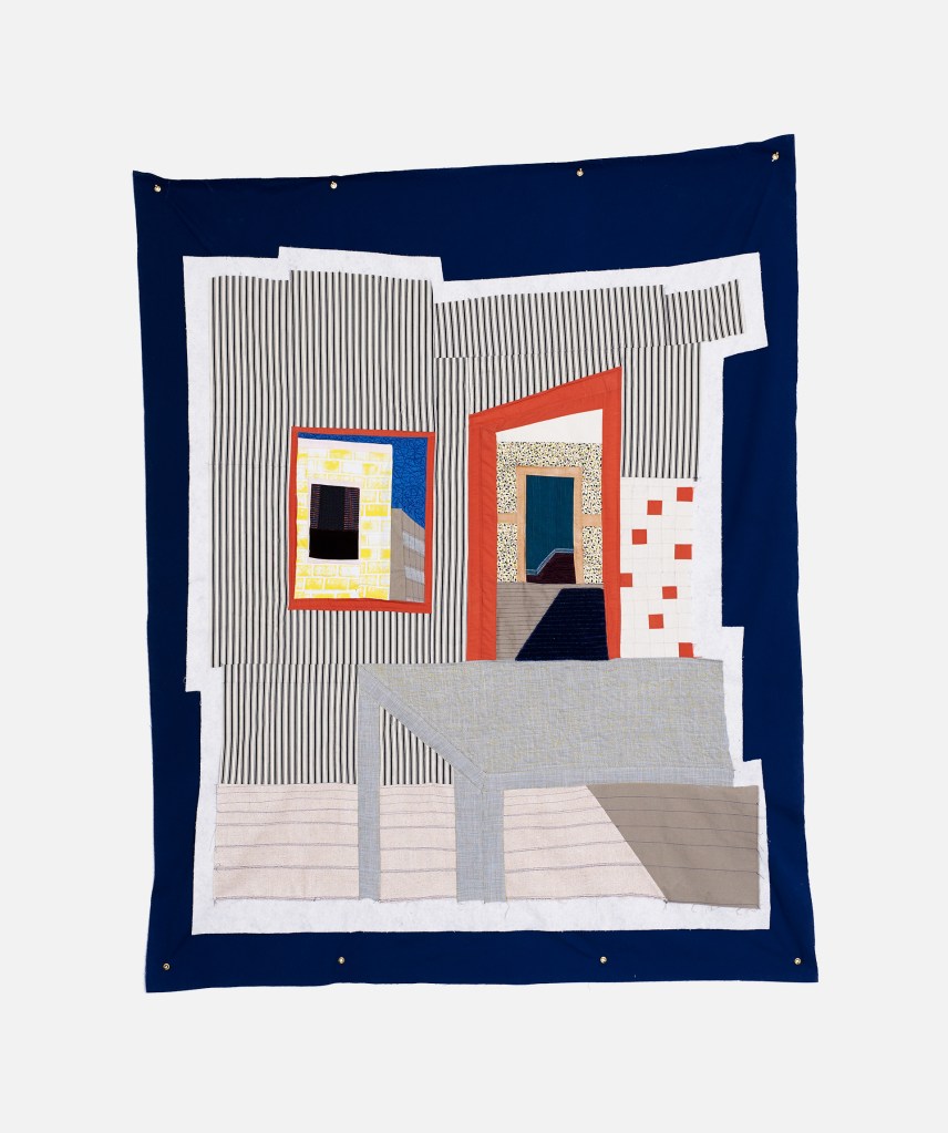 Materials: Found cotton fabric, cotton batting, polyester thread, grommets, nails|